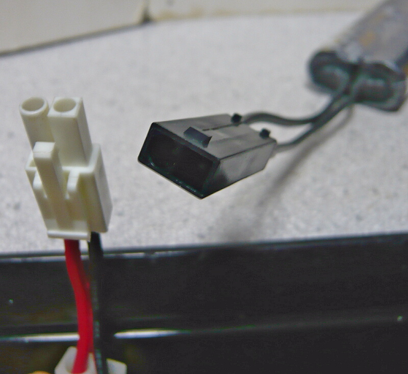 作業の前に端子のどちらがプラスかマイナスかを見ておきます。コネクタを横にした時に縦になっている方がプラスですが、横に書いてあるのでよく見れば間違う事は無いでしょう。