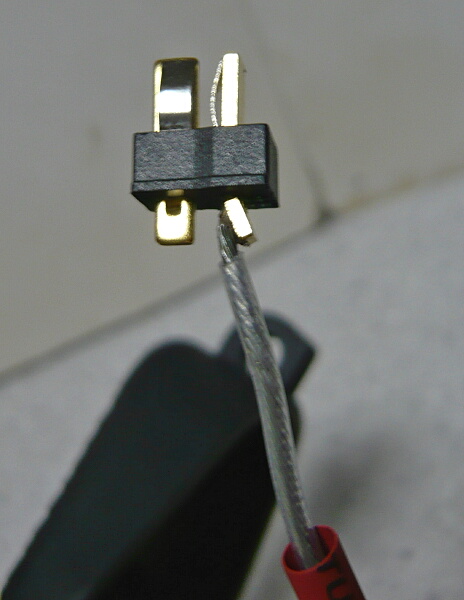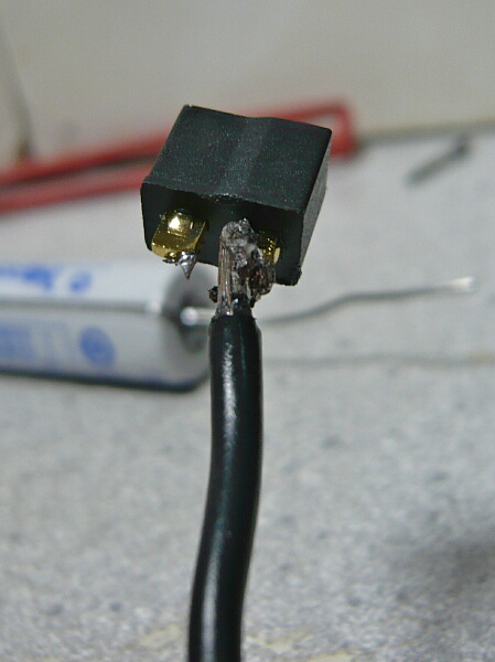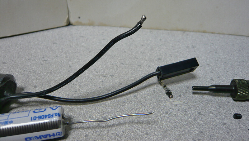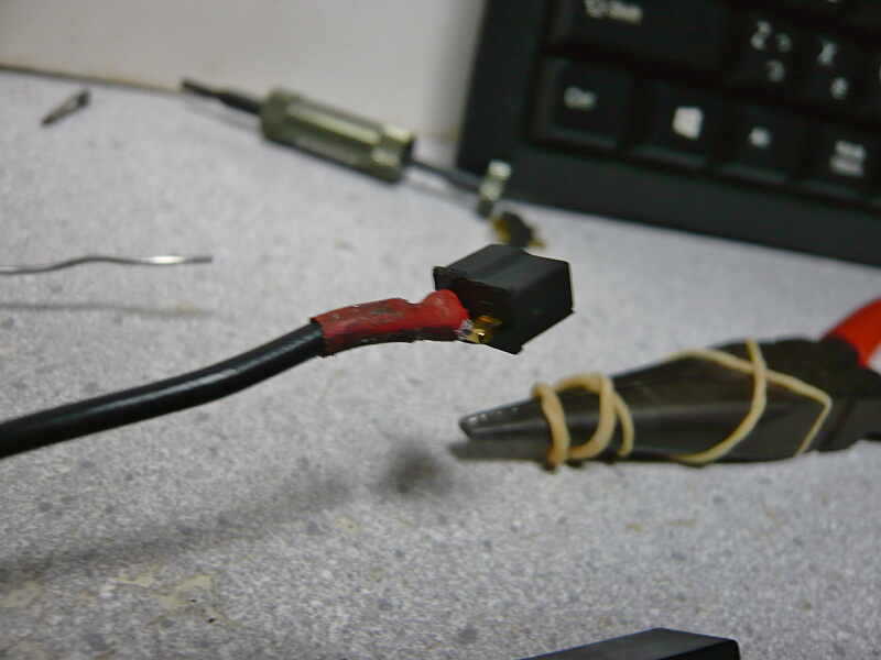 配線と端子についたはんだをはんだごてで熱して溶着させます。プラス端子の内側に付ける時は隣りのマイナス端子に接触しないように注意しながら取り付けます。時間をかけすぎるとコネクタの樹脂部分が熱で溶けて変形するので手短かに。といってもこれがなかなか難しい・・・汚いのは最初なんでご容赦を。