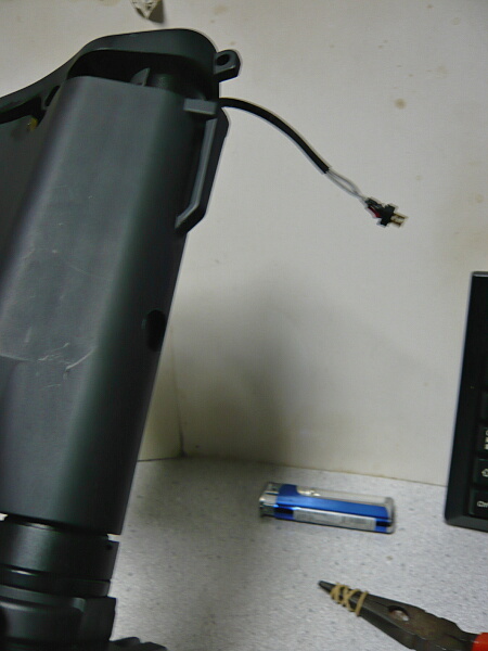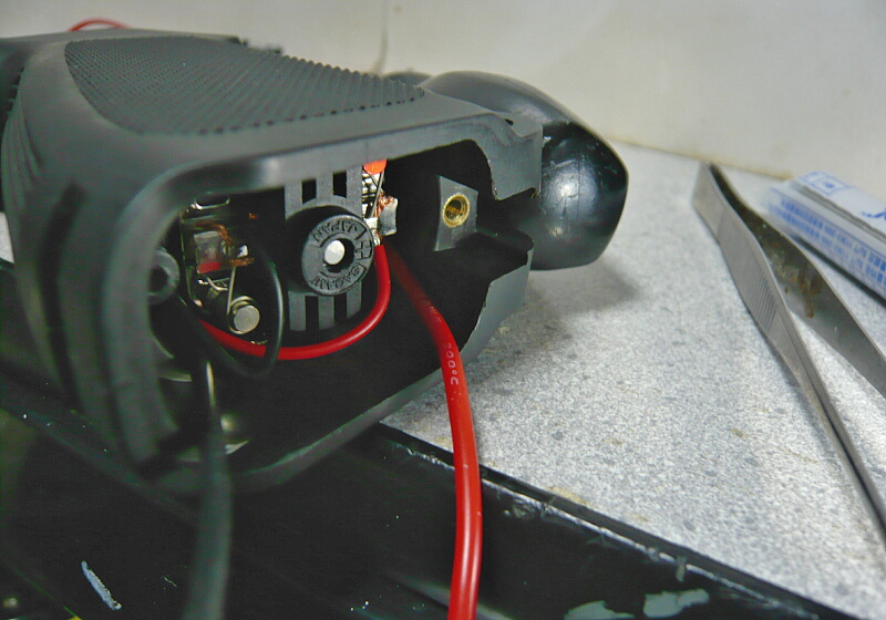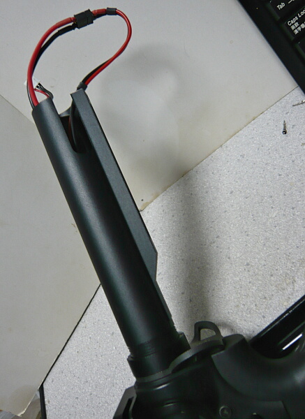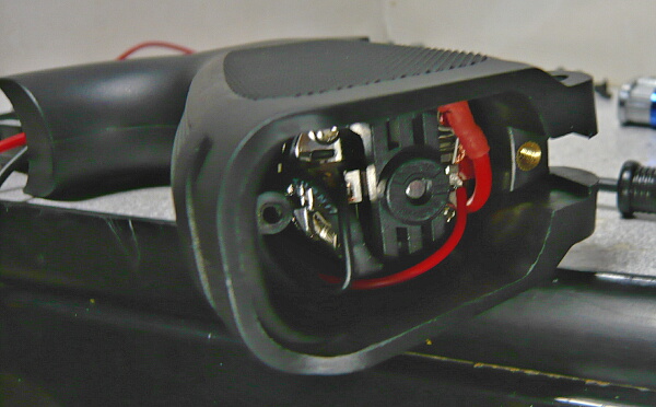メカボックスを開けた状態でグリップを取り付け、モーターを入れて配線の長さを決めます。長いとモーターの脇に収めるのが面倒だし・・・