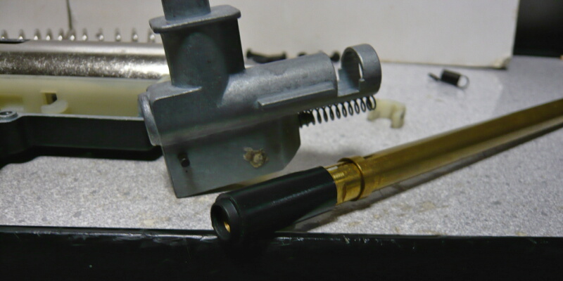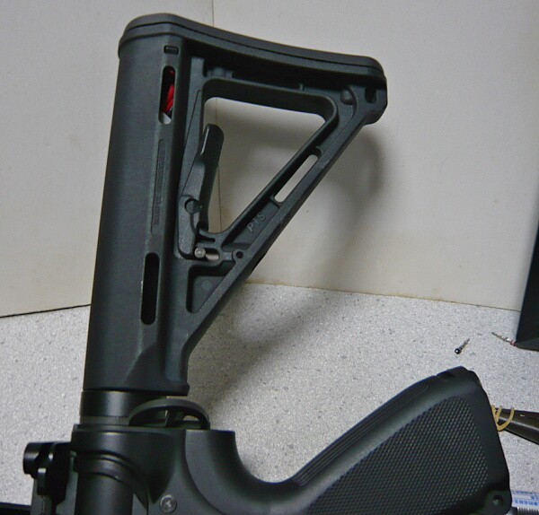 ストックチューブを取り付けます。(前述のスプリングガイドのネジ穴が浅くてストックチューブ固定ネジが刺さりきらないのでワッシャーで調整、ストックチューブ内の奥行きが若干減ってしまいました・・・)