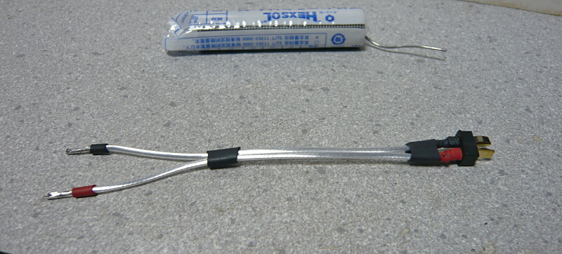 同様にマイナス側もはんだ付けしてチューブを被せて出来上がり。注意点としては端子が近接しているので絶対にショートさせないようにチューブを被せること。