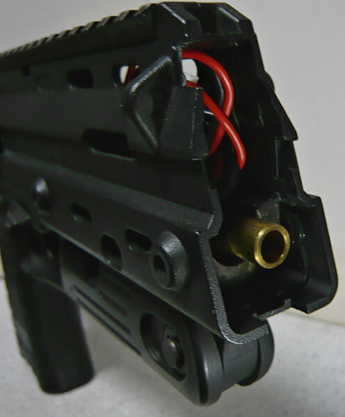 バレルとフレームの間のスペースが大きく取られており、ここにバッテリーが収まります。スペースの後端には斜めに端子が付いています。