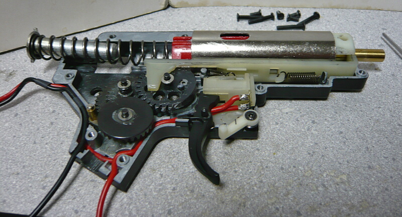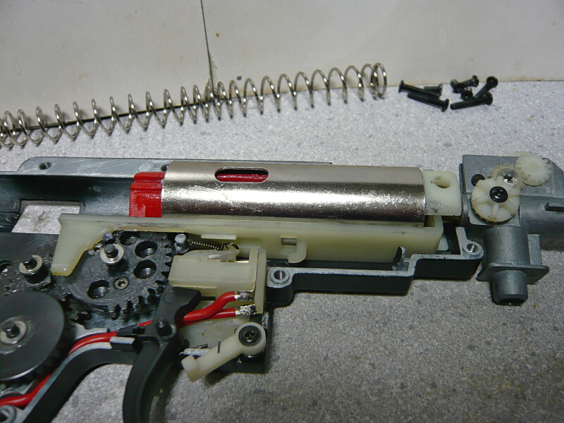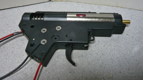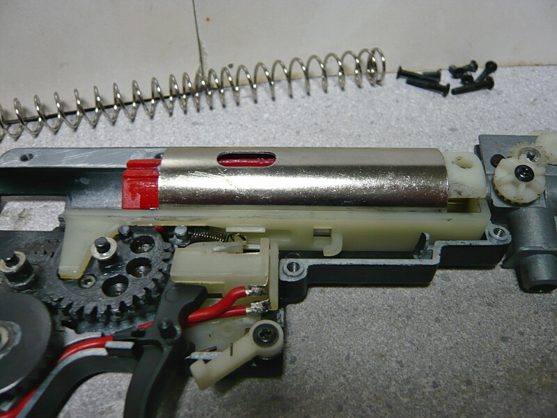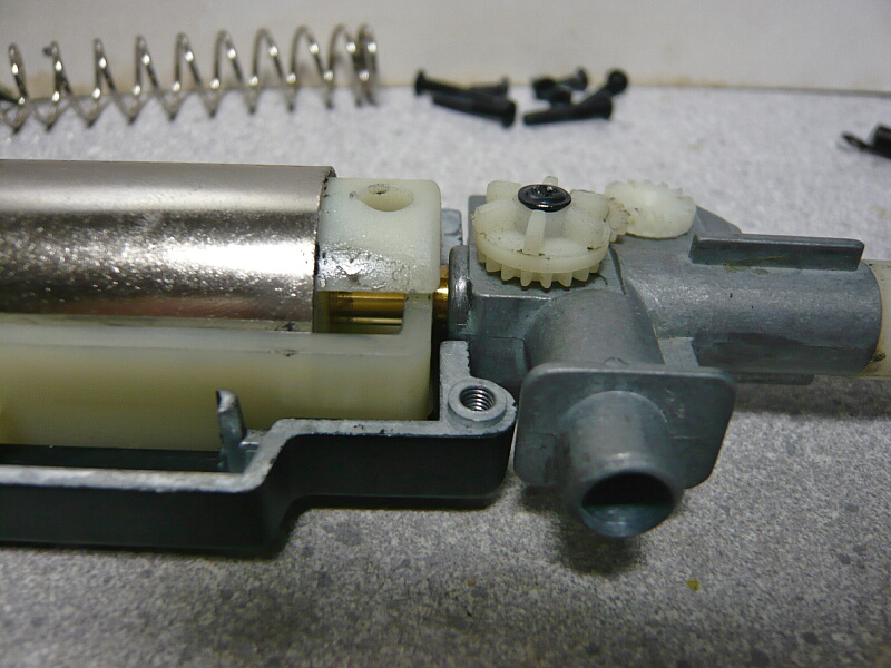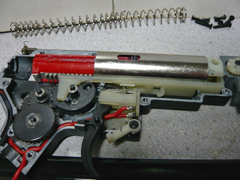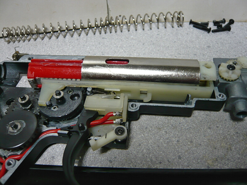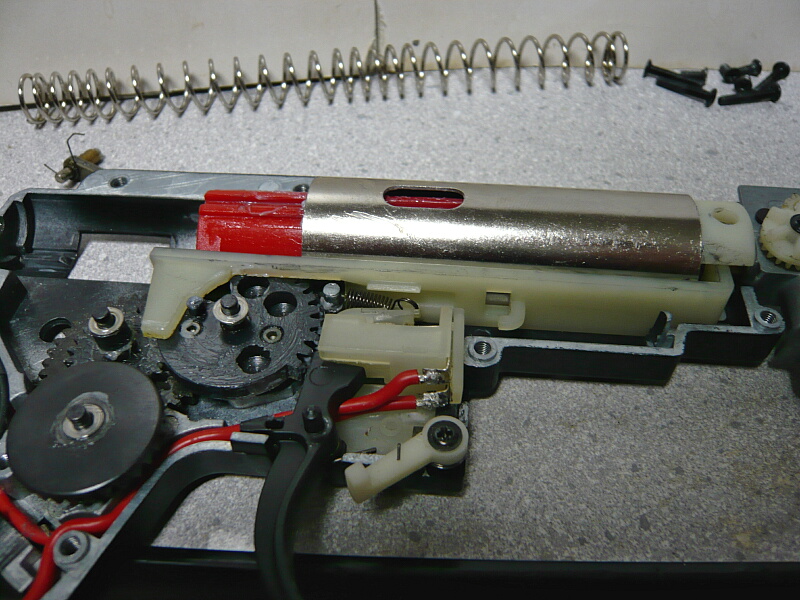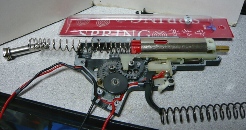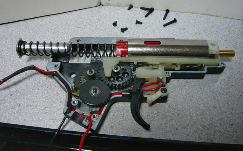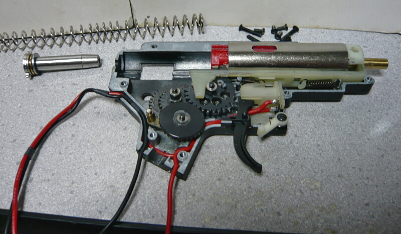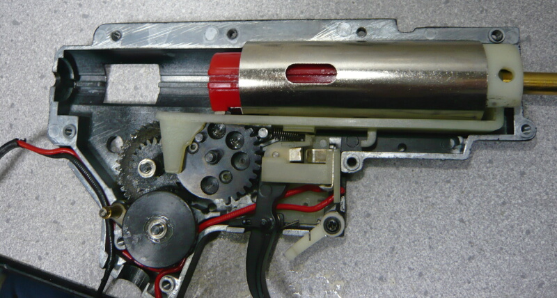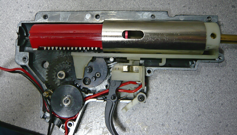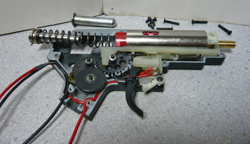 メカボックスを開けます。ノーマルからギヤを13:1ギヤに換えた他はピストンを14枚全金属歯に、ピストンヘッドをアルミピストンヘッドに換えているだけ。モーターはマルイEG30000。