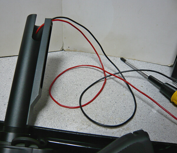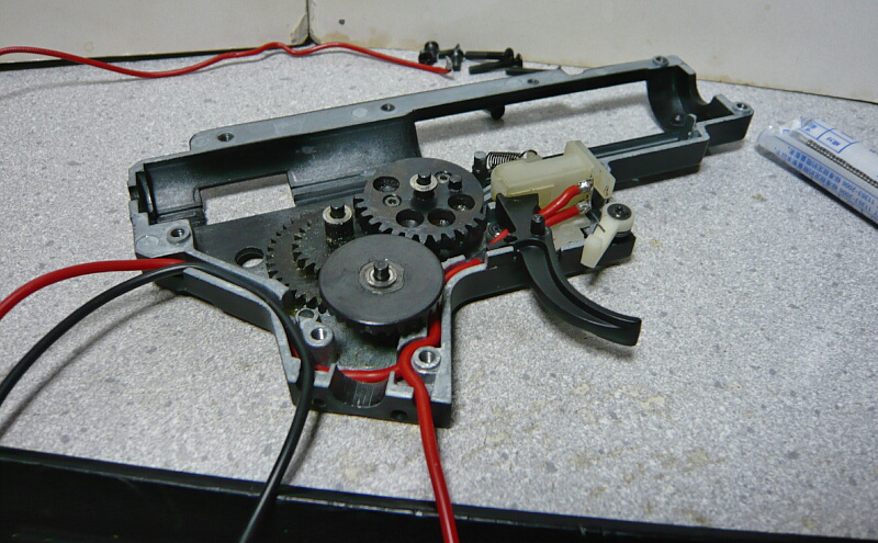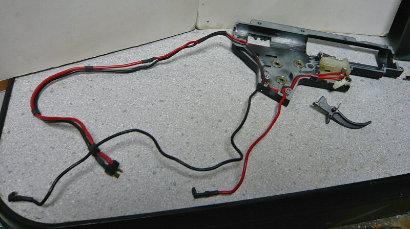 まずは新しい配線を長いままスイッチにはんだ付けし、所定の位置に這わせました。トリガーの辺りは上手く収めないとトリガーの動きに干渉したり、ロワレシーバーにメカボックスを固定するトリガーピンを挿す時に邪魔をしたりします。
