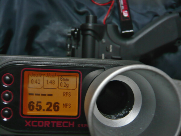 この時点では7.4Vリポで初速は不安定気味で68m/sほど、サイクルは秒23弱。9.6Vで初速88m/s、サイクルは秒28弱というところ。