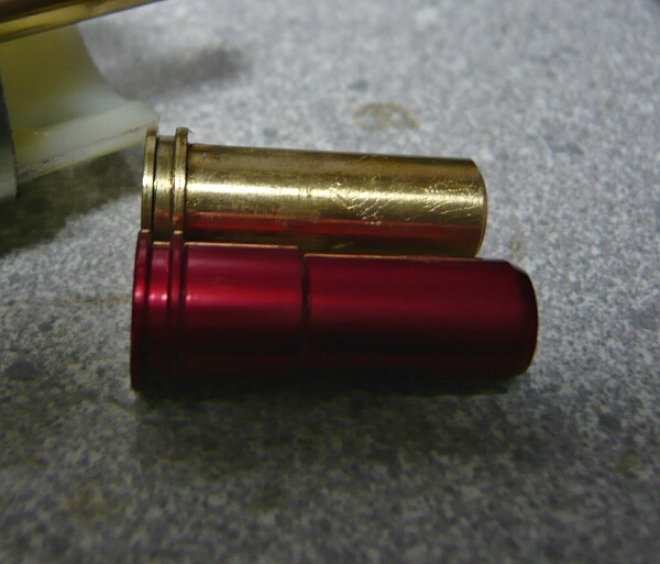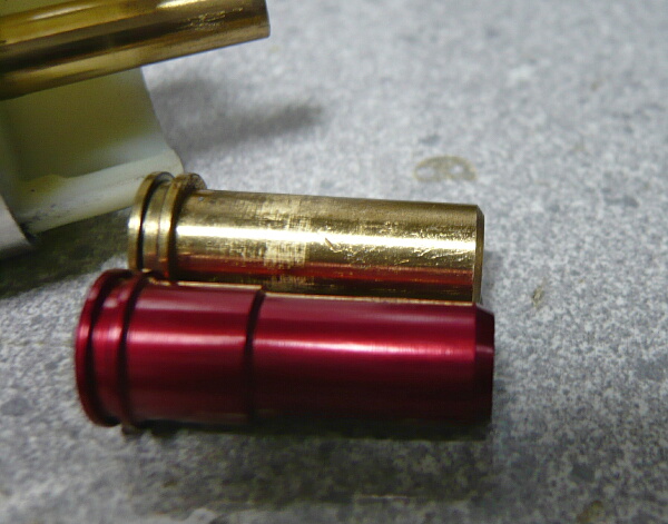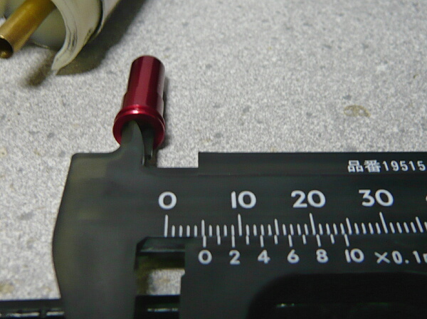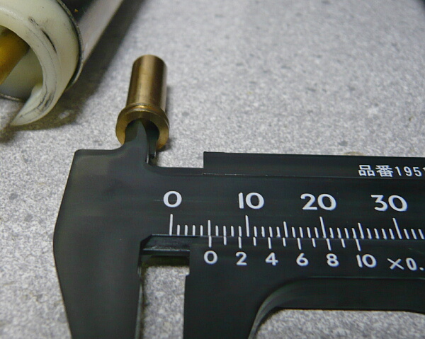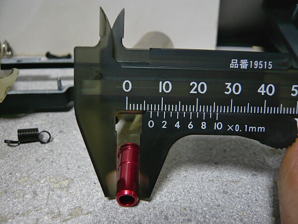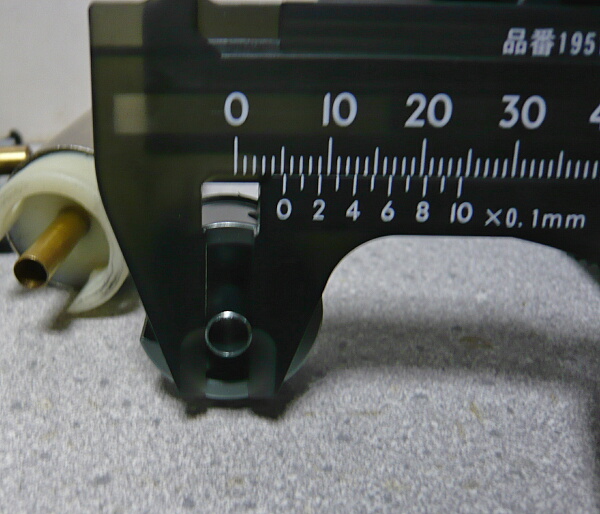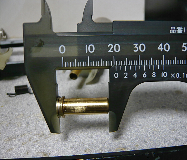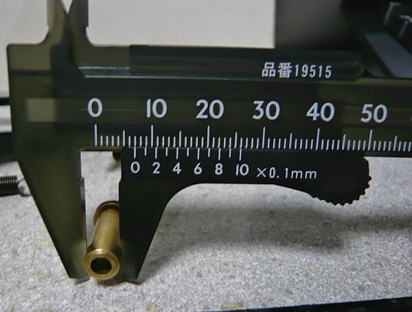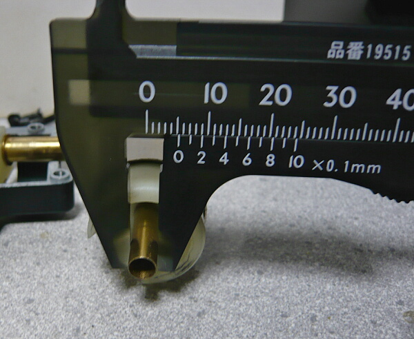とりあえずノズルを換えてみようか・・・と思ったところでそういやこの銃はノズル径が違うと聞いた気がするので、他のノズルがポン付けできるかどうかチェック。まずはシリンダーから出ているパイプの径を測ってみると、5mmとちょっと。
