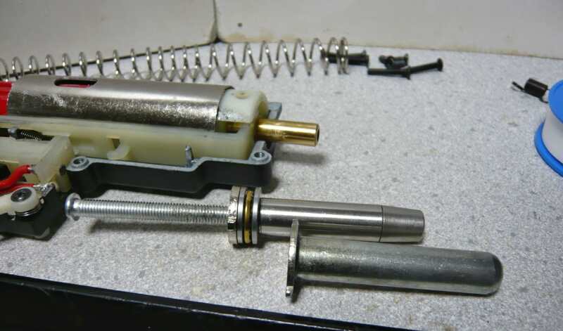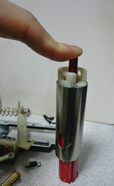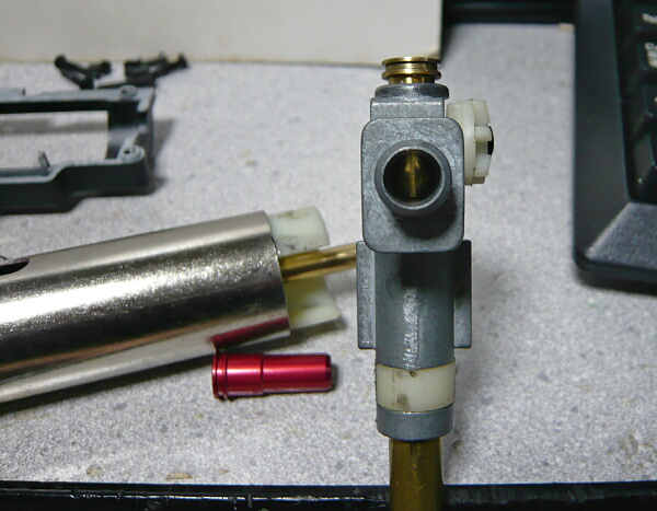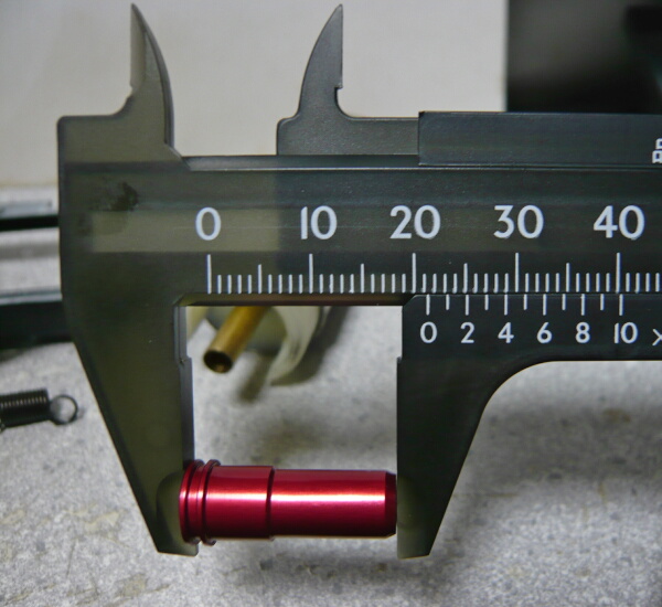 解放側をカットするとピストンの後退量が減りますが、シリンダーの加速穴よりまだずっと後ろにピストンヘッドが後退しているのでシリンダーの有効容量は変わりません。ただしスプリングは縮めきっていないので弱いスプリングに換えたのと同様の効果になるため初速は低下します。また解放側を多くカットしすぎるとタペットプレートを後退させるカムがまだタペットプレートを後退させている状態でピストンを解放してしまいノズルがチャンバーパッキンに接する前に空気を吐出してしまうため初速が大幅に低下する事になります。