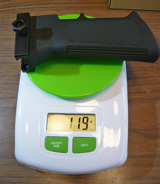 重量は119g。グリップはナイロン樹脂製で軽いのですが、金具が少し重く感じます。