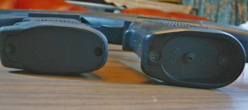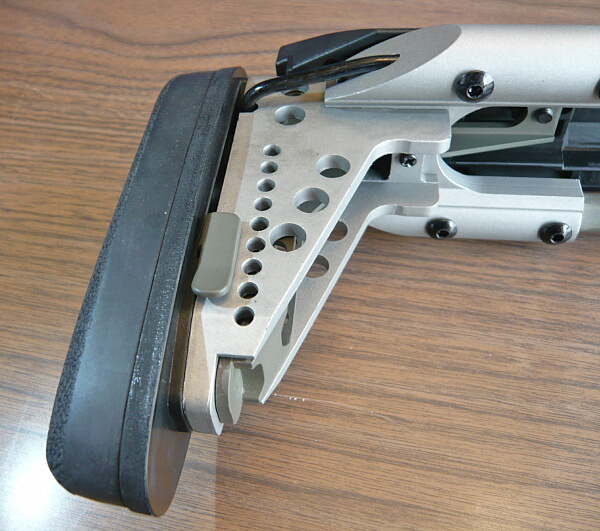 このストックは前後に伸縮する機能の他、可動式のチークパッドも備わっています。バットプレートはゴム製。