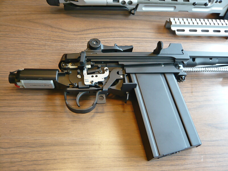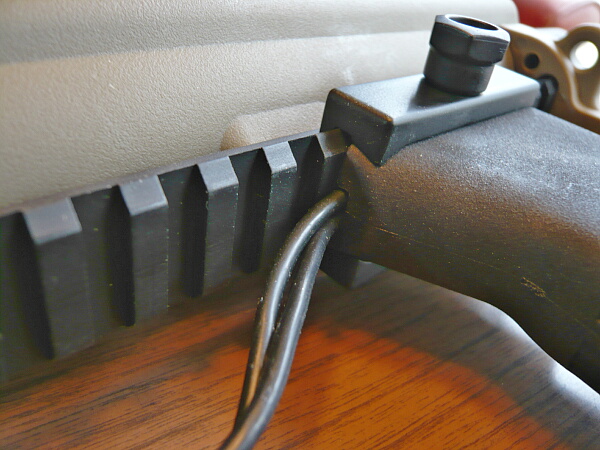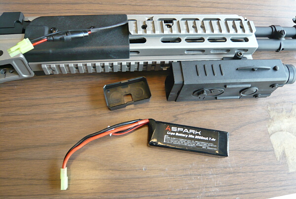 いよいよ実射に入りましょう。バッテリーボックスはハンドガード下のレイルの前半に取り付ければ持つ手の邪魔になりにくいでしょう。左右どちらかに取り付けるとバランスが悪い。M4と違い上に取り付けるとサイトが見えなくなります。