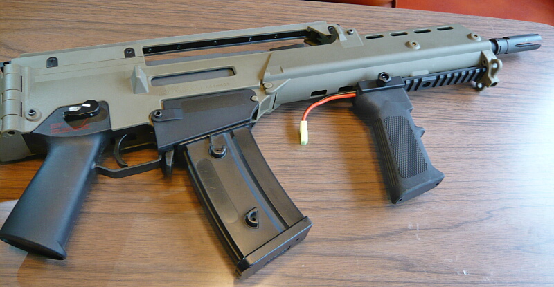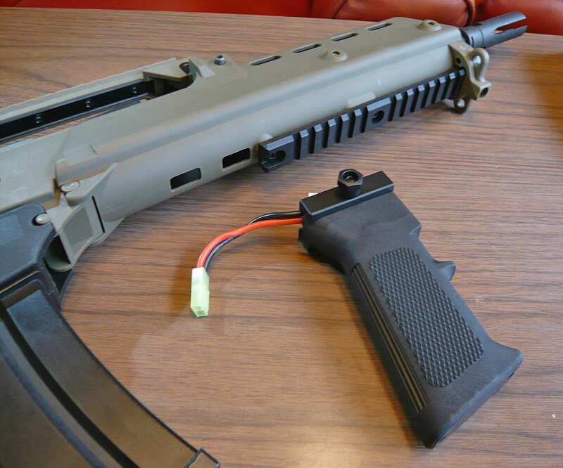 それでは銃にとりつけてみましょう。A2タイプだしM4を例にしたかったのですがウチのM4はKeyMoDばっかりなので取り付けるにはKeyMoD用のレイルが必要。しかしそのレイルをどこかへやっちゃって探しても見つからなかったので仕方なくアンダーレイルが付いた銃としてすぐ出せるところにあったG36。箱にはMP5 batteries pistol gripなんて書いてありますがハンドガード下に20mmレイルがあって前出し配線がフォアグリップを付けた位置まで届きさえすれば銃は何でもOK。