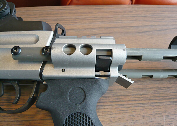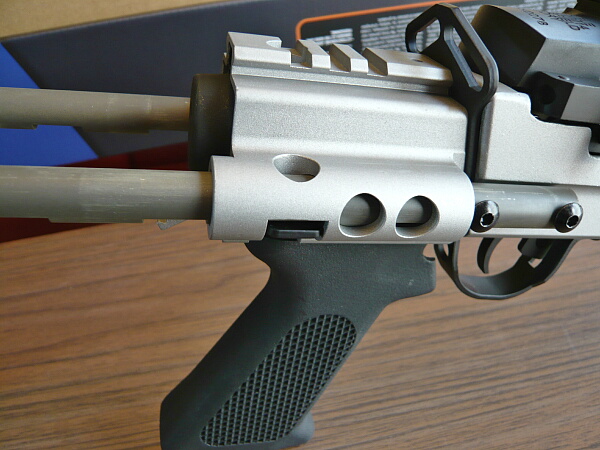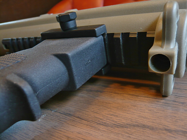 フロントサイトは黒い樹脂製で、後面がセレーションの入ったランプ状のもの。その後方には光学サイト取り付け用のレイルがあります。ただしこのレイルは専用のマウントが必要で、普通の20mmレイル用のマウントリングは取り付きませんでした。(横方向の溝が浅くてネジが通りません)