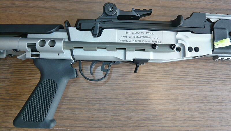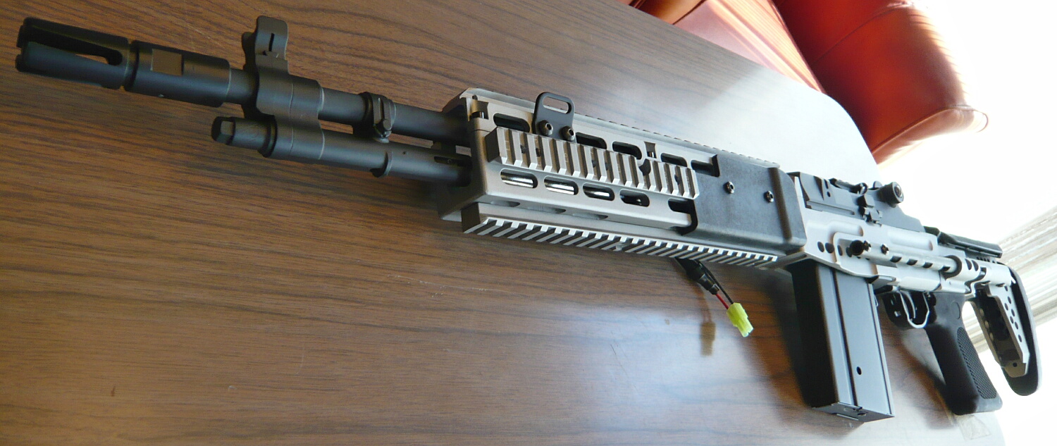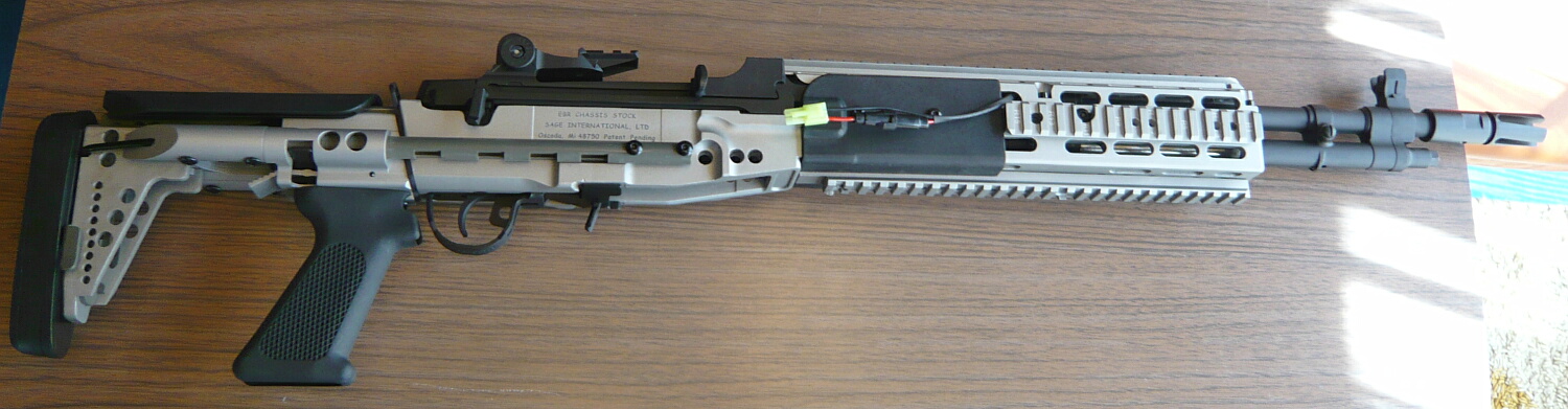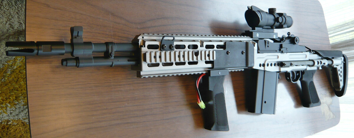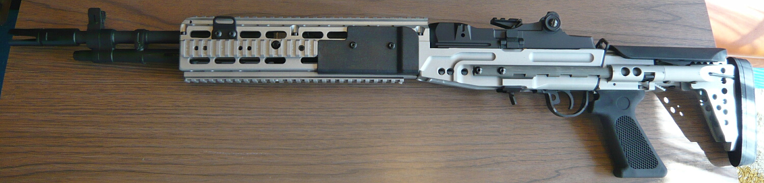 数十年が経ちイラクなど砂漠の開けた戦域に於いてはM16、その改良型であるM4は今度は射程不足・威力不足となり、長射程高威力なM14が再び脚光を浴びる事になりました。M14はベトナム戦の頃に置き換えられる直前に木製ストックから樹脂製ストックに置き換えが始まっていましたが、曲銃床は狙撃用途にはともかくフルオートの制御などにおいては不利であったためピストルグリップと直銃床を備えるM14DMRが海兵隊で使用される一方、この銃床をさらに時代の趨勢ともいえるピカティニーレイルを備えたアルミ製のシャーシに進化させたものが2004年から米海軍に配備されたMk.14EBR(Enhanced Battle Rifle)です。Mod.0はその初期タイプでM14としては短銃身である18インチバレルを持ち、特徴的なスライドストックを備えています。