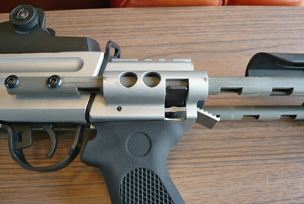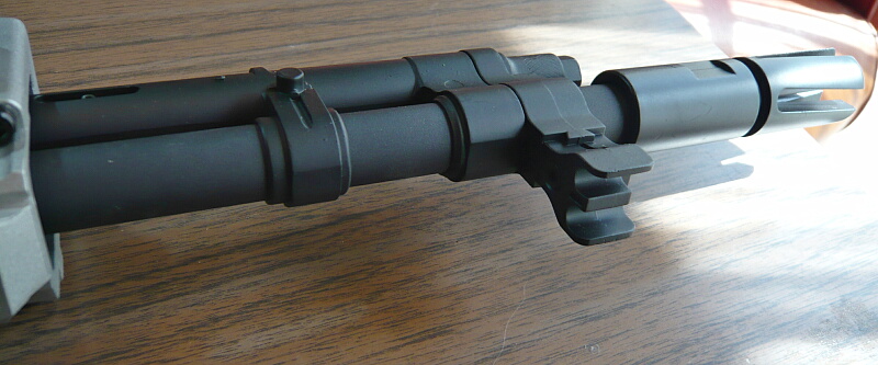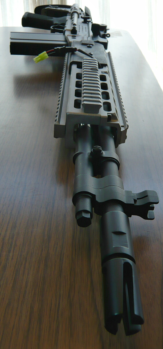 ハンドガードから前に露出したアウターバレル。ハイダーは下にイモネジが刺さっている部分までで、14mm逆ネジタイプ。細いアウターバレル先端に数センチ被さるように取り付いています。
