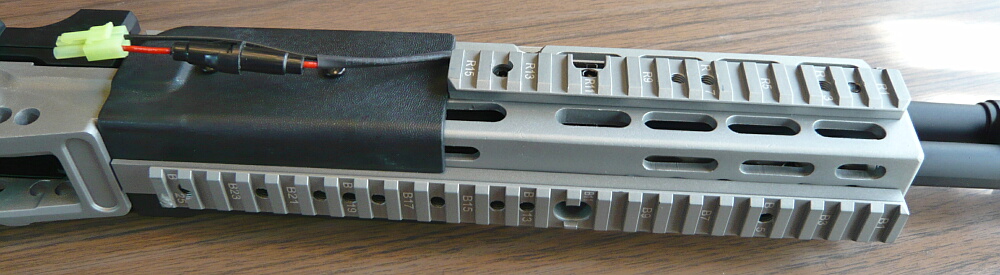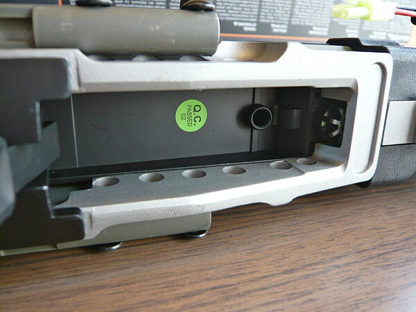 ハンドガード右下。銀色に塗装されており、上下左右にレイルがあります。上のレイルはハンドガードに固定ですが左右と下のレイルは別体でネジ留めされています。ハンドガード後半左右には樹脂製のカバーがネジ留めされており、4面レイルのハンドガードとしては握りやすく考慮されています。バッテリー配線はハンドガード上半分と下半分の間、コッキングレバーの前端が当たる位置から外に出ています(コッキングレバーには当たらないようになっています)。ヒューズボックスとタミヤコネクタが少し大きく目立つので飾る派の人はちょっと気になるかもしれません。