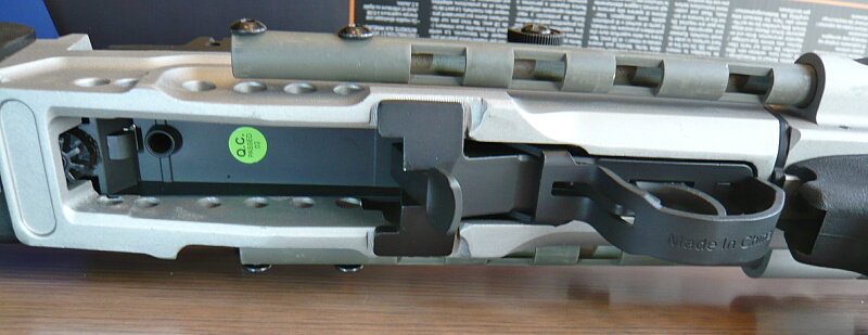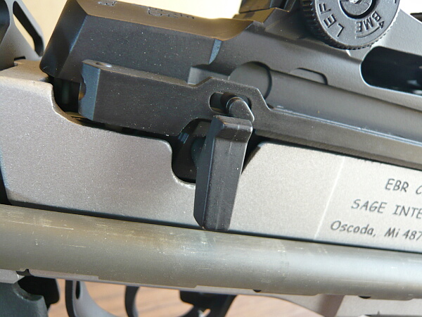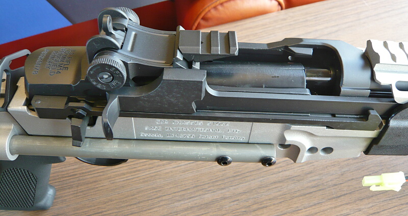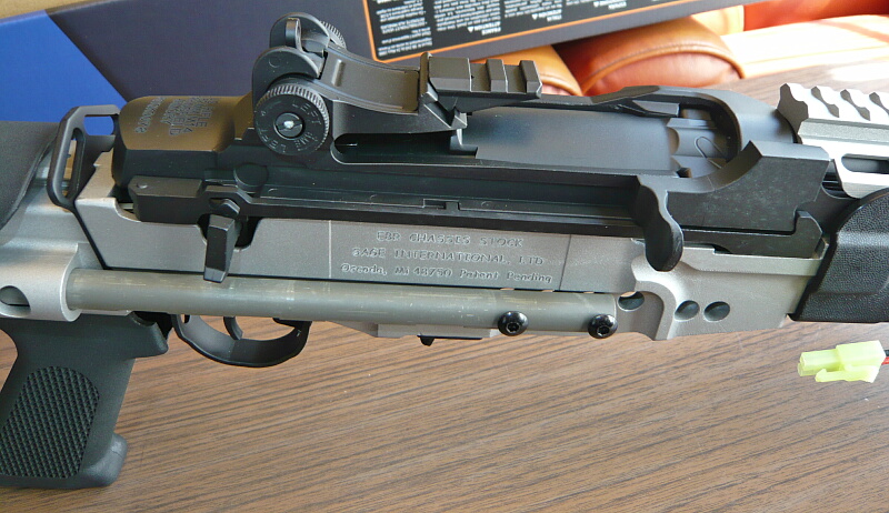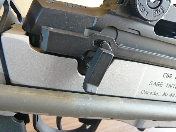 レシーバー付近右側。レシーバー(上部の黒い部分)右にはコッキングレバーがあり、その後方にセミ/フル切り替えのセレクターが生えています。シャーシ右側面には刻印があります。開発したSAGE社の名などが刻まれています。