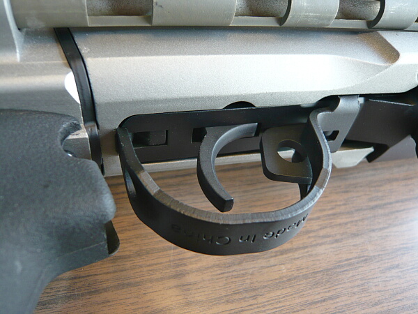 トリガーガード内から押し出すとセーフティOFF。ON→OFFは一瞬ですがOFF→ONはトリガーガードから指を出すだけでは届かないのでグリップを握る手を少しずらさなくてはならず、あまり操作性はよくありません。ON→OFFも普段からトリガーに指を掛けっぱなし前提になってしまうので安全上あまり良いレイアウトではないように思えます。ここは親指で操作するセレクターやセーフティと較べてしまうとツライところ。
