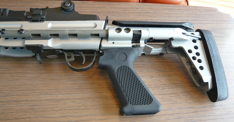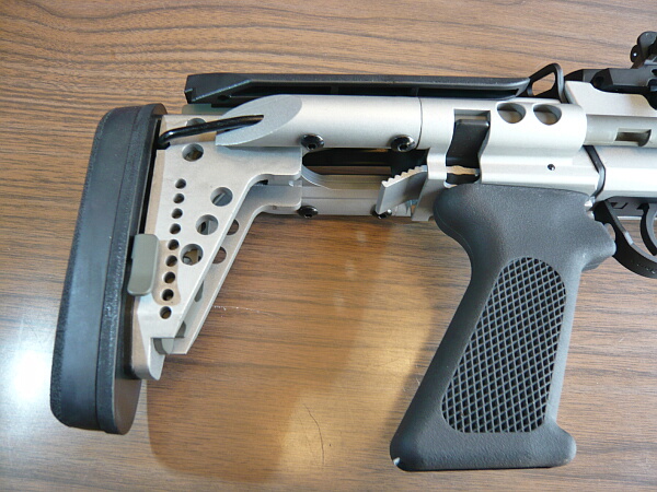 ストックを伸縮させるにはグリップ後方のレバーを下に下げながらストックを引き出します。上に操作するなら良かったんだけれど、下に下げながらストックを引き出すのは片手ではやりにくい…