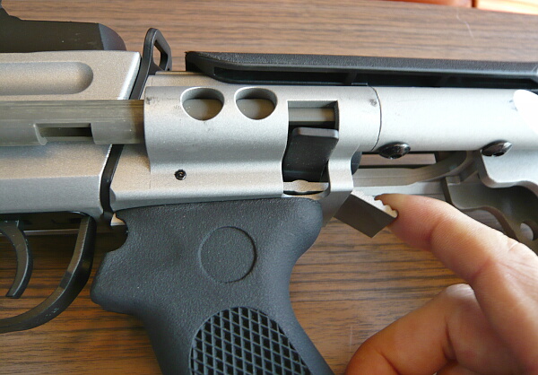 後方に傾ければ滑り落ちてきますが、バレル右下のエジェクターチューブから左に生えているエジェクターヘッドを後方へ押すとその真後ろにあるカートが押し出されてきます。エジェクターはフルストロークで、カートを完全に排出するまで押し出す事ができます。