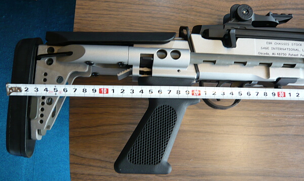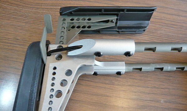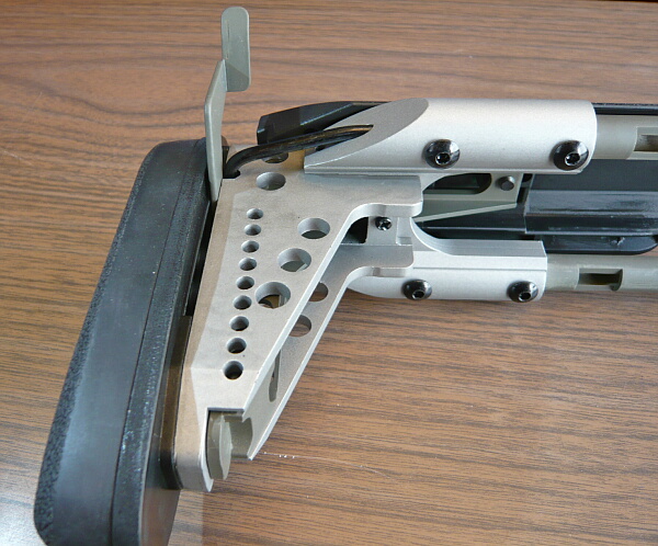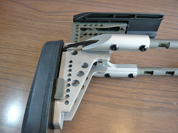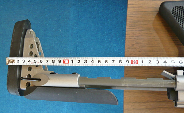 位置を合わせたらレバーを倒して固定。チークパッドはスコープを載せた時に利用しますが調整幅が大きすぎる気がします。ストックを伸ばした状態でチークパッドを一番下まで下げてしまうとストックを縮めた時にストック基部上面のレイルにぶつかって縮めきれなくなるのでちょっとだけ浮かした状態のところまでで留める必要があります。縮めきらない前提なら下げきってもOK。