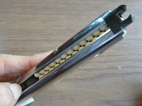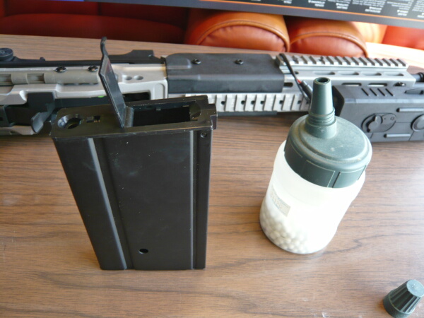マガジン上面にはフタがあり、ここを開けてBB弾を流し込み、ゼンマイを巻く事でマガジンが使用可能となります。装弾数は400発。