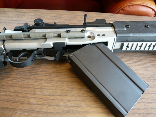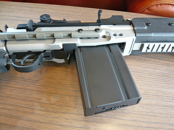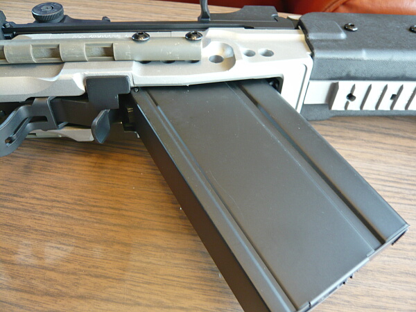 マガジンはAKのように前を引っ掛けてから後ろに引いてロックするタイプですが、AKよりはG3の方に近いかも?