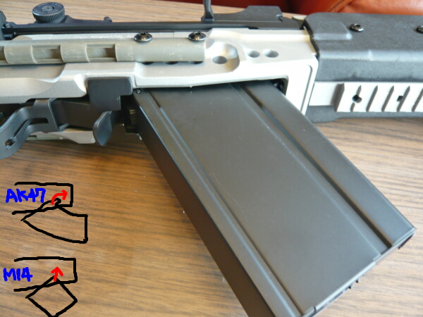 AKの場合はマガジン前端の突起をマガジンポートの前端内側に引っ掛ける感じですが、M14はマガジンポートの前奥にマガジン上面先端を突っ込むとスイッチが入ったような手応えがある感じ。