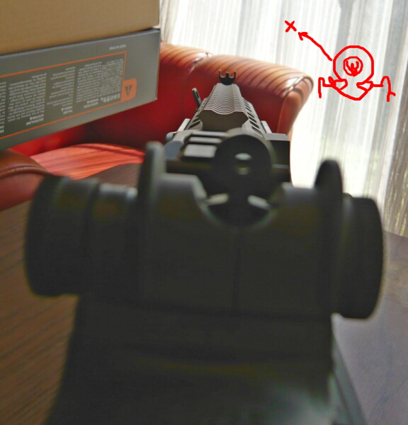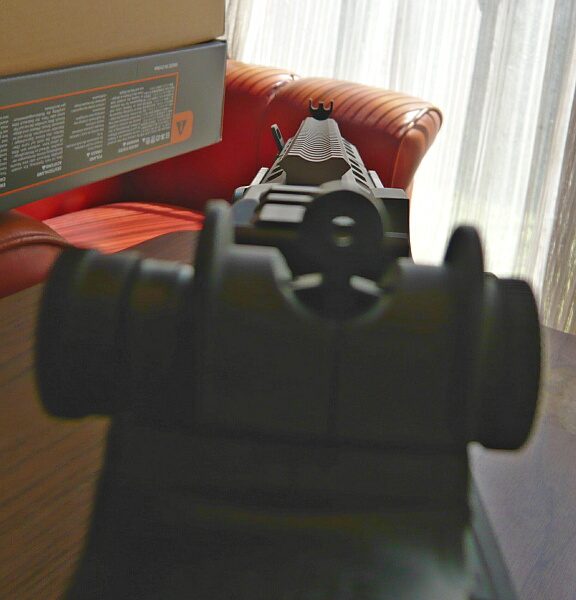リヤサイト前のレイルとハンドガード上のレイルにブリッジさせてみたところ。ACOGでもギリギリ届きます。つり合いがとれて真っ直ぐを向きますが、目から遠くて実用外。惜しい。