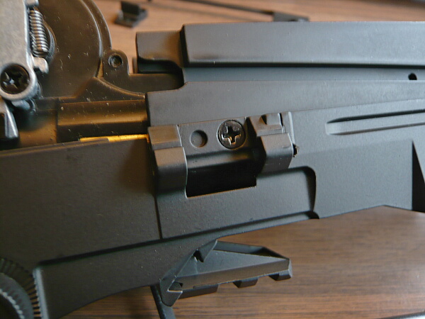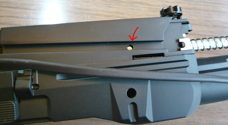 ホップアップは可変タイプで、調整はバレル付け根最後端上部にあるイモネジを付属のLレンチで回して調整します。