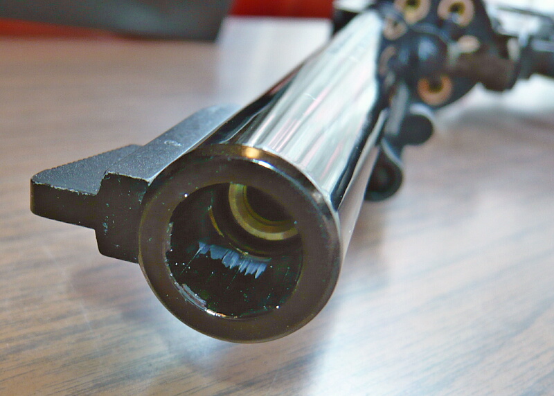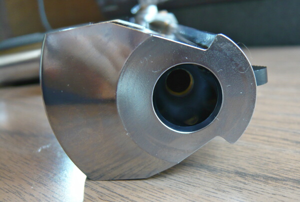 各部を観察。銃口は大きく開口しておりライフリング表現もあります。1cmほど奥に真鍮製のインナーバレル前端が見えます。