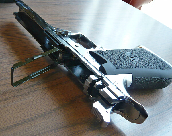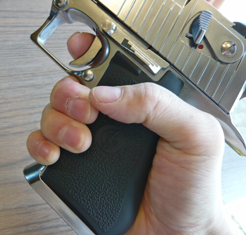 大きな銃ですがグリップは太いなりにまだ握りにくいというほどではありません。手の大きさにかなり依存するとは思いますが、ベレッタM92Fのグリップに慣れている人はそんなに太さがキツイとは思わないでしょう。セーフティも握った親指で何とか操作できます。ただしハンマーは無理なので左手で起こす必要があります。
