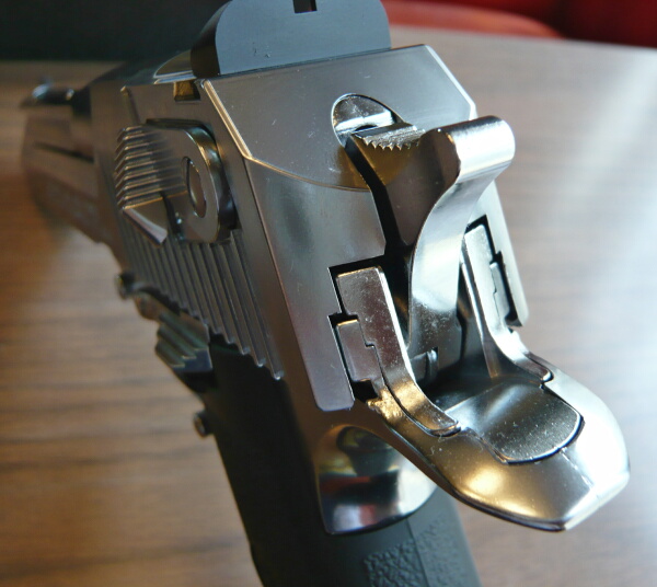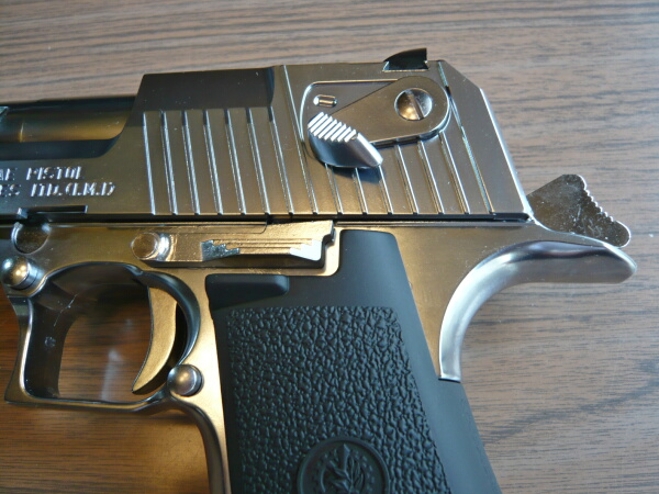 スライド後方左面やトリガー周り。トリガーやスライドストップなどは金属製でメッキの風合いに差があります。スライド側面にあるセーフティスイッチは樹脂製。