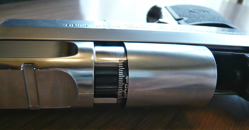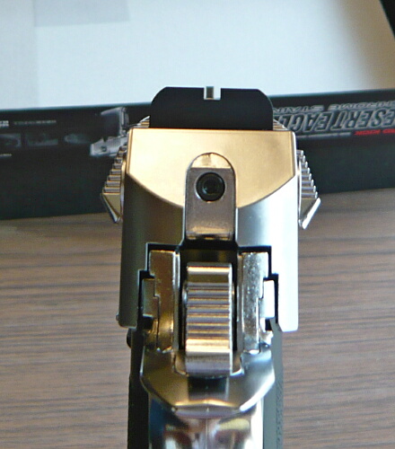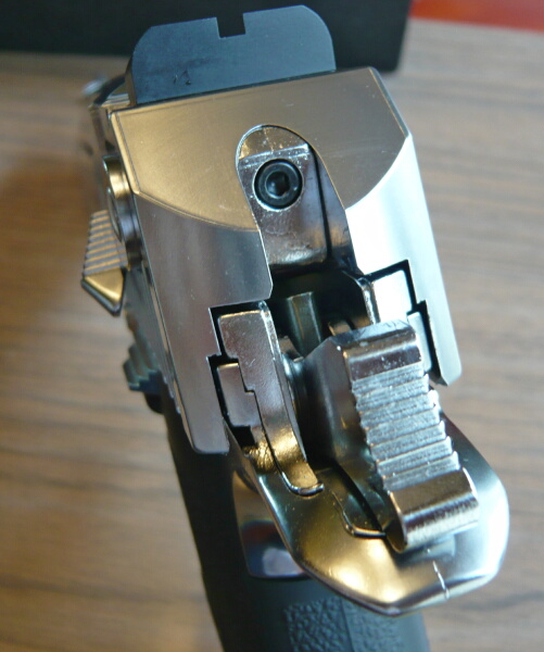 フロントサイトはSAAのシンプルな半月状のものから大柄なランプ(傾斜)タイプのものに変わっており、SAAとの明確な識別点でもあります。ランプ面にはセレーション(ギザギザ)があり、光の反射を抑えます。この製品はWディープブラックの美しいメッキがかけられた樹脂パーツに対して、亜鉛合金製のパーツの仕上げがごく普通の黒染めなので統一感が無いのが少々惜しいところでしょうか。