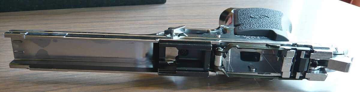 銃本体左右。クロームステンレスモデルはハイキャパ5.1ステンレスのような銀色塗装ではなく、メッキ処理がされています。表面はヌラヌラしたメッキ光沢ではなく半光沢といった風合いで、反射は抑え気味。