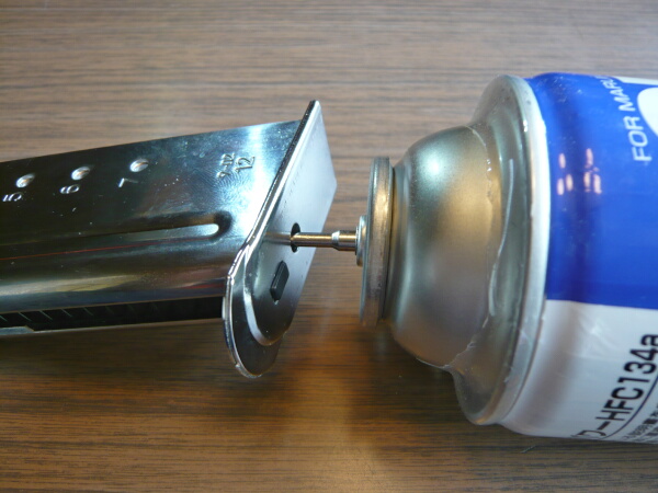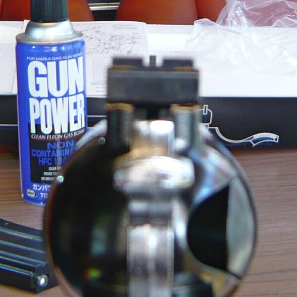 まずはガスをグリップ底部の注入口から注入します。注入口は少し後方に傾いています。