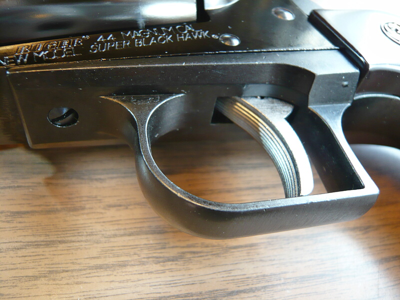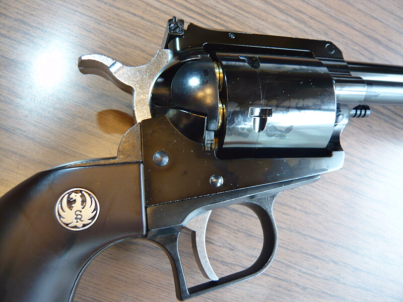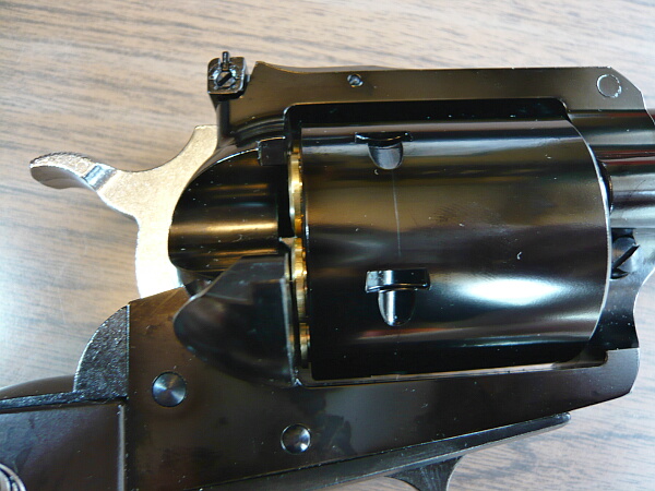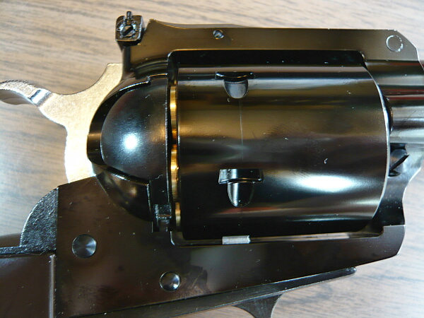 フレーム左面。シリンダーの下に刻印があり、「ニューモデル」・スーパーブラックホークである事が示されています。シリンダーは.44マグナム弾を使用するための強化としてフルート(溝)が省略され、シリンダー自体が巨大な円筒状の異様さを醸しています。