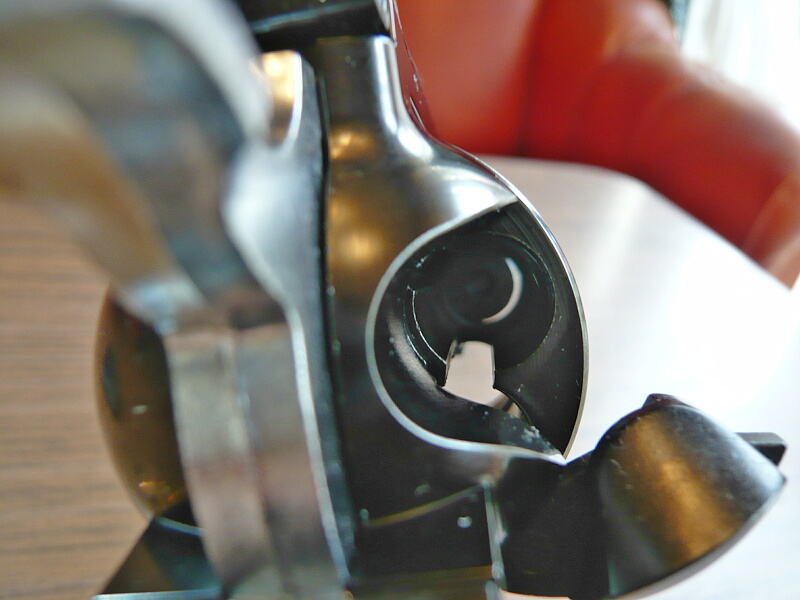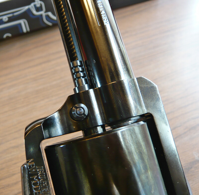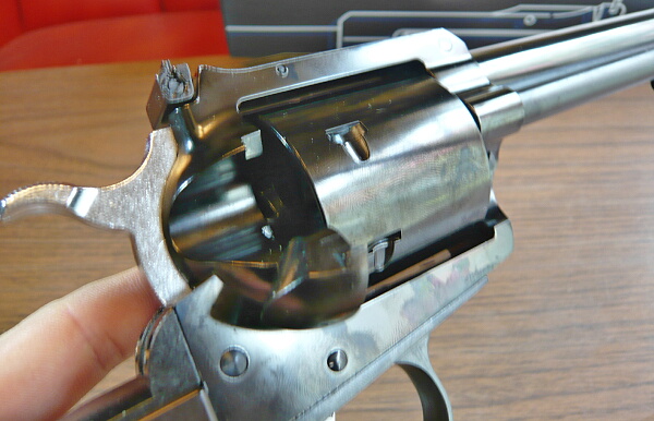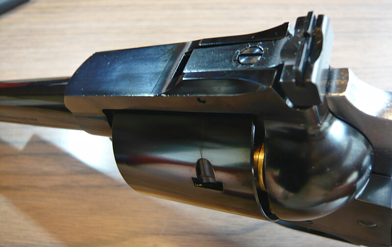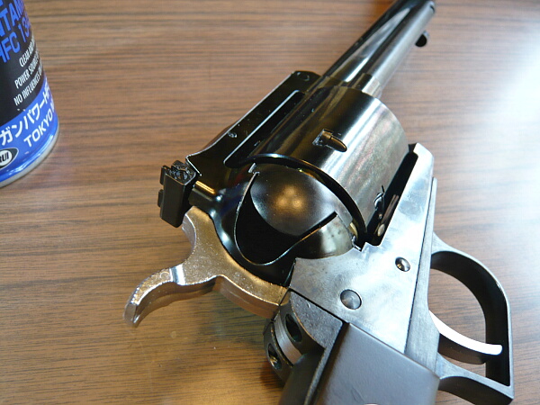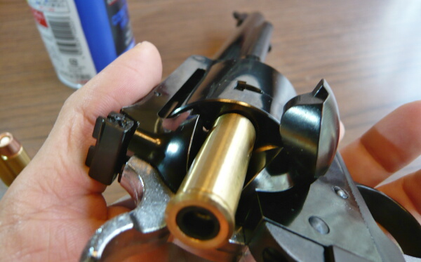 ここがシリンダー前面に噛み込んでシリンダーの動きを渋くする原因になっている部分ではあるのですが、新しいモデルほどここは動きが軽くされておりこの銃ではローディングゲートをあけてシリンダーを手で勢いよく回せばチャララーッと回る程度にまで軽くなっています。