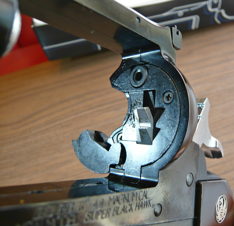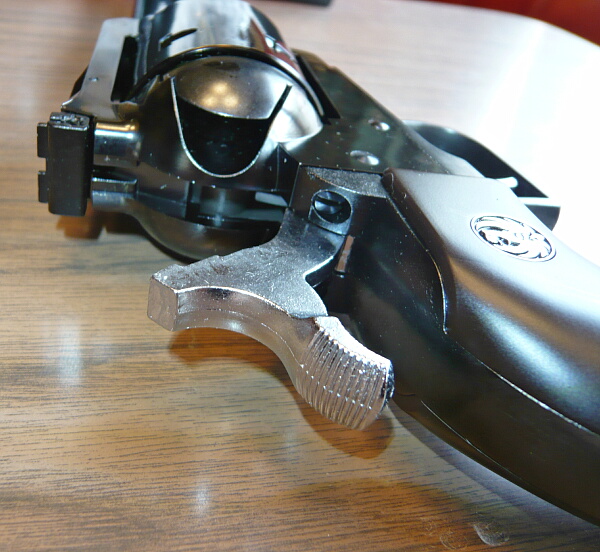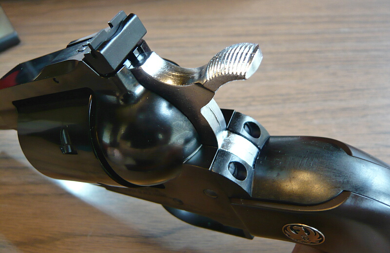 ハンマーを起こすとカッ、チッ、というタッチ。ハーフコックは無く、フルコックでのみ止まります。ニューモデル・スーパーブラックホークではシリンダーに装填されたカートの後面を直接ハンマーで叩くのをやめて間にプレートを介しここを自動セーフティとしているのでハンマーが倒れている状態でハンマー後部を叩いても撃発する事が無いように改められています。なのでSAAにはあったハンマーの前面の突起がありません。