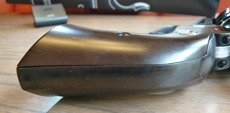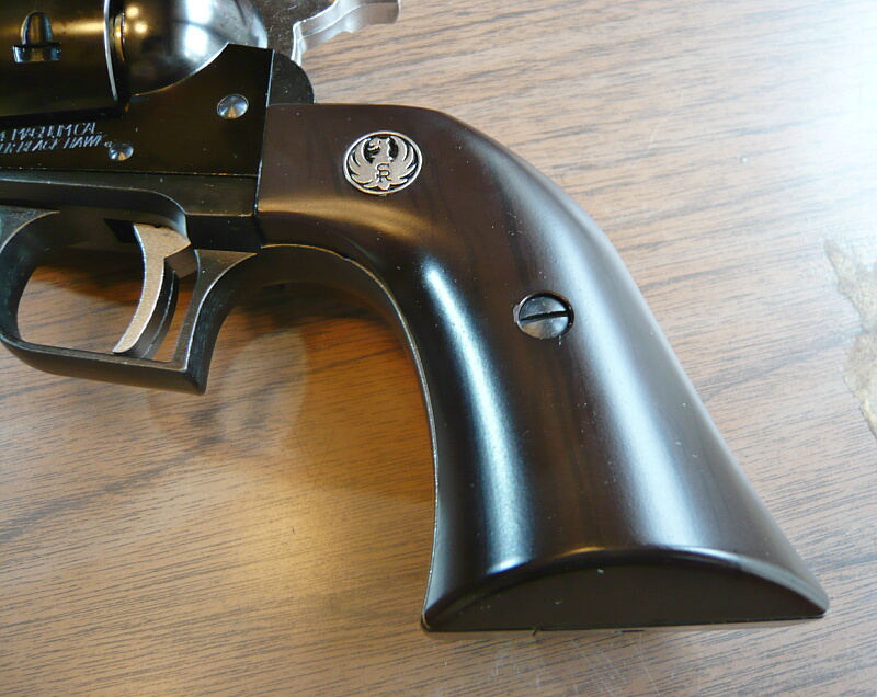 グリップはプラグリップ仕様なので樹脂製のもの。こげ茶色で木目様の黒い模様がプリントされています。スタームルガーのメダリオンがグリップ上方にあります。