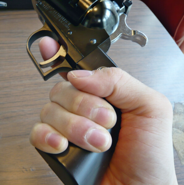 グリップの握り心地はSAAとほぼ同じ。トリガーは幅広なのでここだけはSAAと明確に違い、S&WM29のものに似た印象。トリガープルは5mmほどの長めに感じるストロークがあります。軽くもなく重くもなく、スムーズな引き心地。