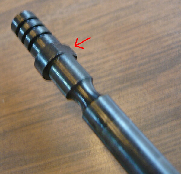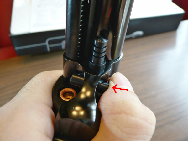 ベースピンのここ、ここです。D断面の平らな部分を上、アウターバレルと接する面に合わせて差し込みます。