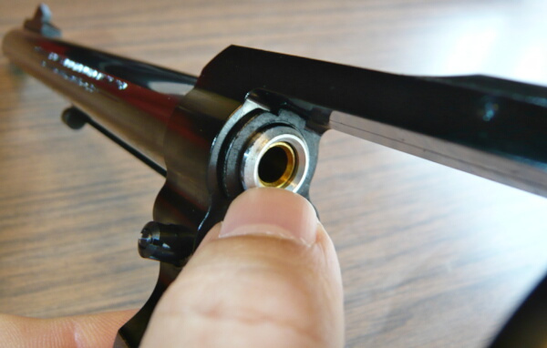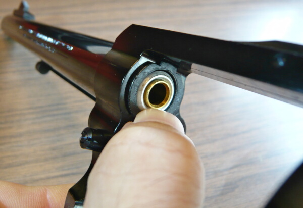 フォーシングコーン(バレル再後端のシリンダーと接する部分)はマルシンのリボルバーのお約束として可動してシリンダーとの気密をとる機構となっています。