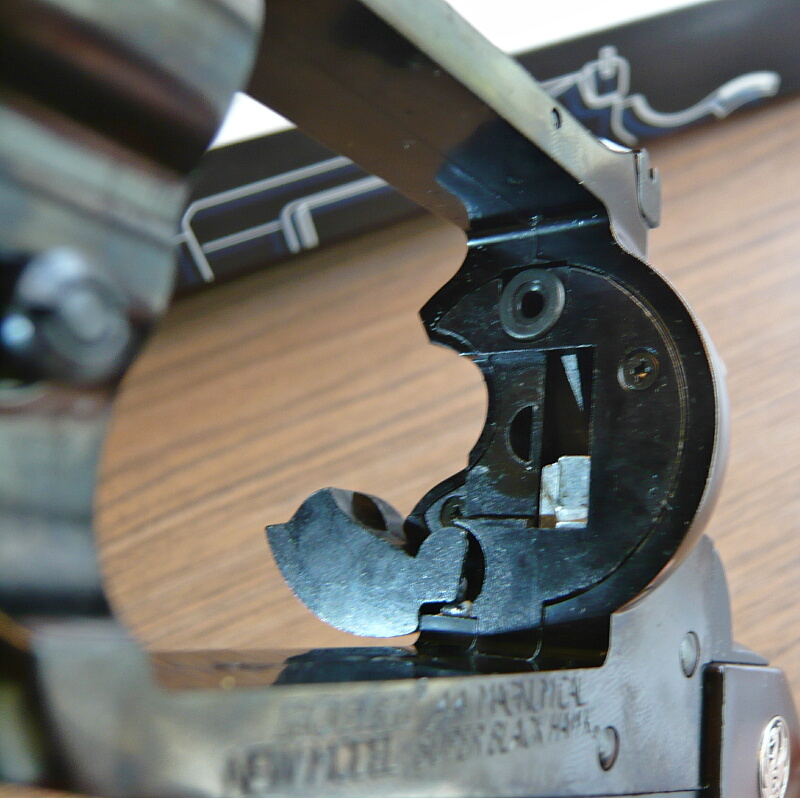 ハンマーを起こすと中央の半月穴の隣にシリンダーハンドがせり出してきてシリンダーを回転させます。(この個体ではハンマーコック時にシリンダーが僅かに動き足りないのか、ゆっくりハンマーをコックした後にシリンダーを動かすと僅かに動いてチッと音がしてロックします。ハンマーを勢いよく起こせばロックされるので射撃にはあまり影響はしていない様子…)