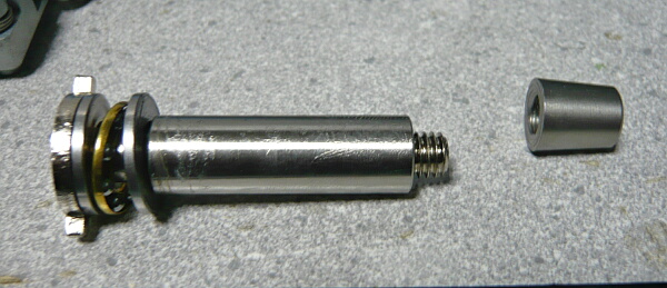 スラストベアリング付きのスプリングガイドは先端のパーツでその後ろの筒を保持し、筒が更に後ろのスラストベアリングを保持しています。そのため先端のパーツがスラストベアリングの動きが伝達されて来て回ってしまうとネジが緩んできて終いにはスプリングガイドが分解してしまいます。