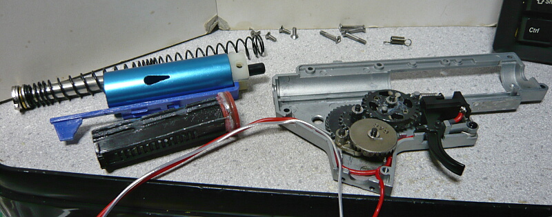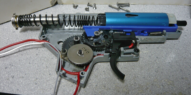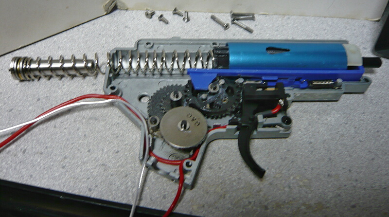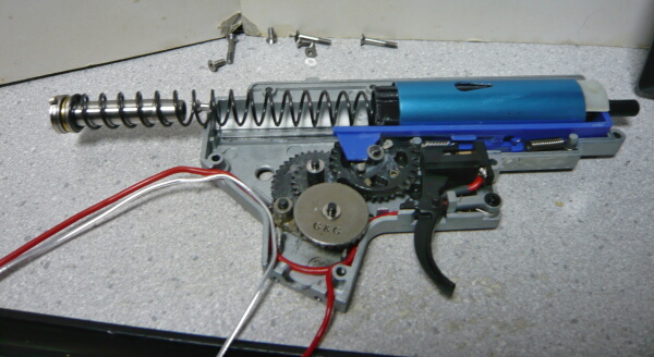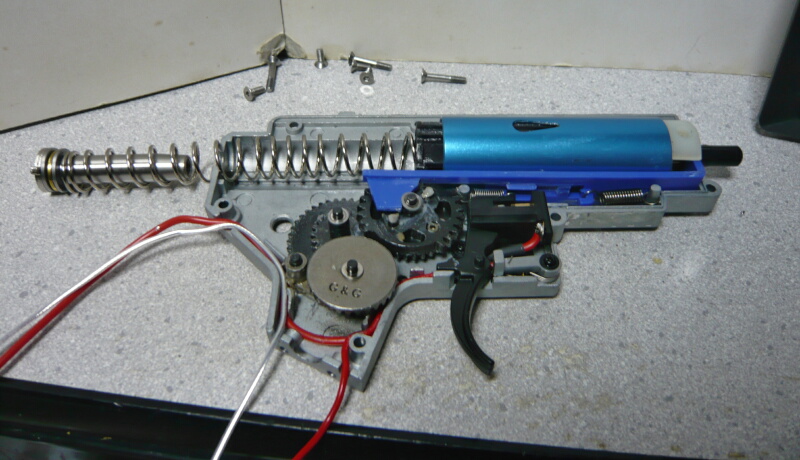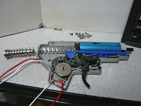 前回ではドノーマル状態から配線の引き直し、シム調整、ピストンとピストンヘッドとスプリングガイドの交換、そしてDSGと専用タペットプレートの組み込みを行いましたが、スプリングがノーマルのままだったため初速が60m/s程度と低く、サイクルも9.6Vで秒24と冴えなかったので今回は主にスプリングの変更を行います。