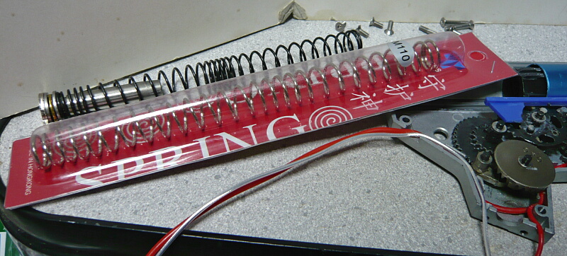 スプリングレートが高まるとそれを縮めながらメカボックスに収めるのがつらくなってきます。110ですらスプリングガイドを2回発射してしまったのでこれにさらにスペーサーを入れたり更に高レートのスプリングとなると非常にしんどいものがあります・・・メカボックス後方からスプリングガイドを外してスプリングを取り出せるタイプのメカボックスの銃を選んでこういうカスタムを行った方が苦労が無いでしょう。そういうメカボックスのガワも売っていますので置き換えてしまうのも有り。