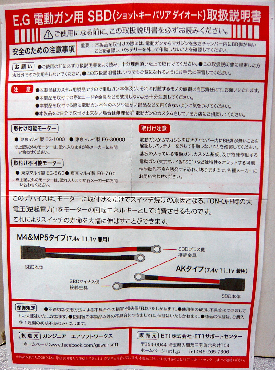 ET1のリポバッテリーに付属の説明書と同様の見やすい説明書。M4&MP5用(Ver.2メカボックス)とAK用(Ver.3メカボックス)の説明があり、それぞれ配線の長さが適正化されているようです。MP5KはVer.3なのでAK用が適合するのでしょうか?