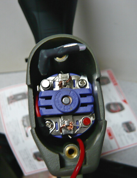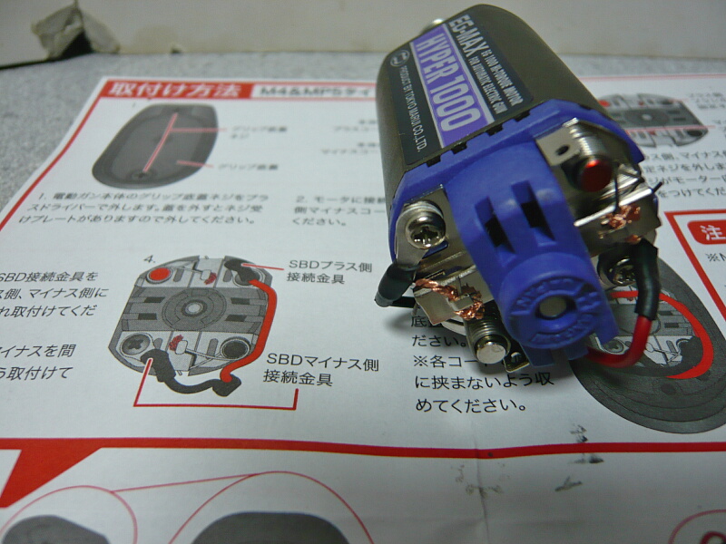 SBDとは前述の通り「ショットキーバリアダイオード」の略で、セミオートを多用した時にスイッチに起こるスパークによってスイッチの接点が消耗するのを軽減するもの。原理としてはスイッチに流れる大電流をダイオードによって整流し、モーターで吸収させるようになっています。スイッチ焼けを解消するというとFETがありますが、SBDがあちらに較べると「軽減」に留まるものの、構成が簡単で低コストというメリットがあります。またFETユニットは結構大きいので占有スペースが結構バカになりませんがSBDはグリップ内にわずかに占有するだけというのも特徴。