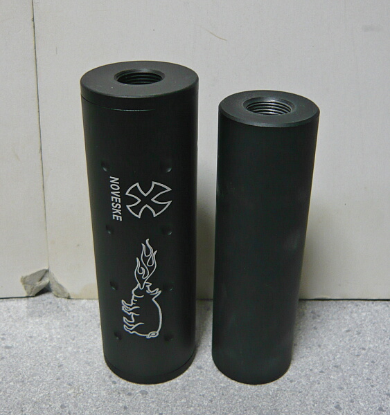 EZサプレッサー本体。側面に1か所だけNOVESKEのロゴとファイアーピッグが描かれている他、丸いディンプル(窪み)がいくつか付いています。