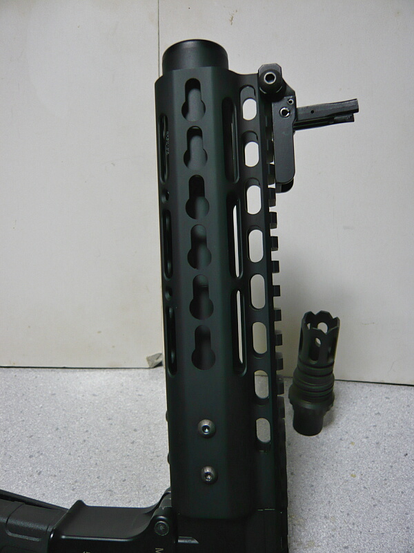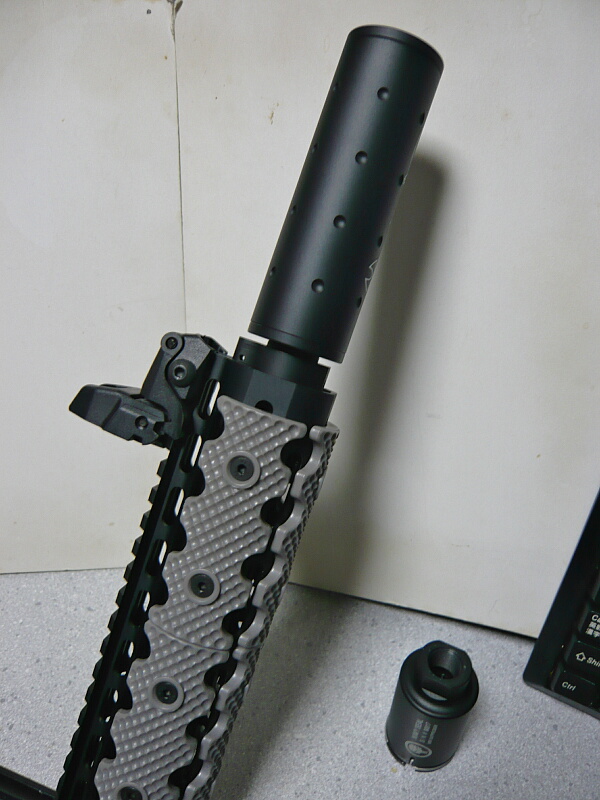 代わりにタボールに付けていたKM企画のフェザーウェイトサプレッサー65をこちらに。こっちは径が30mmなのでkeymodハンドガードにきれいに収まります。でも、もうちょっと前に突き出てても良いかな・・・でも差別化してこの方がいいかな・・・
